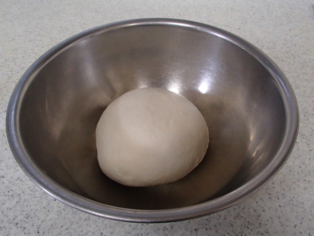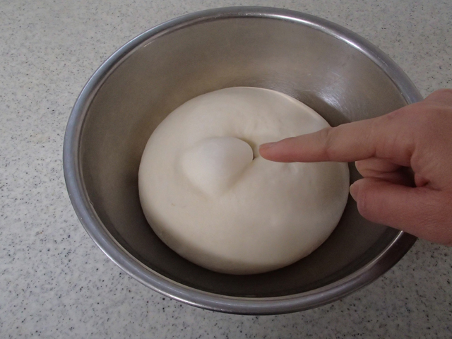 4.生地が2倍の大きさになったら、*フィンガーテストをする。 (人差し指を生地に指し込んで指の跡が残っている状態)ガス抜きをして丸め直す。