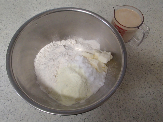 ・粉を計量し、砂糖、スキムミルク、塩、バターをボウルに入れる。