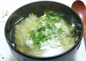 熱々ご飯におダシを入れて、七草をのせてどうぞぉ~。邪気邪気とんでけぇ~!