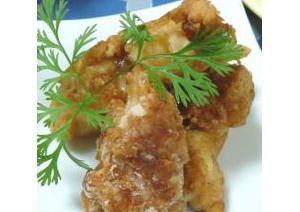 片栗粉が鶏に馴染まないようにつけてからすぐに焼き揚げする。