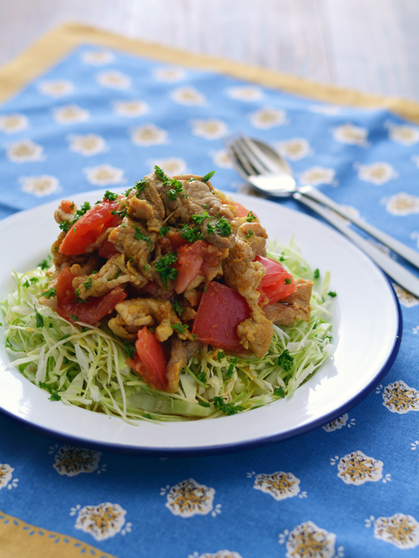 葉物野菜はレタスでもいいのですが、キャベツの千切りにしてみました。