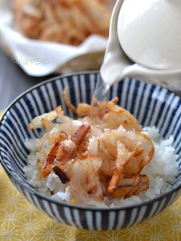 温かいごはんに「いかの一夜干しと玉ねぎのかき揚げ」をのせ、あご出汁をかけて出汁茶漬けでいただく。