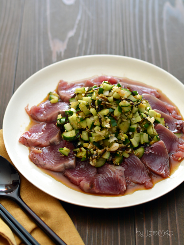 カツオの塩昆布きゅうりのせ
