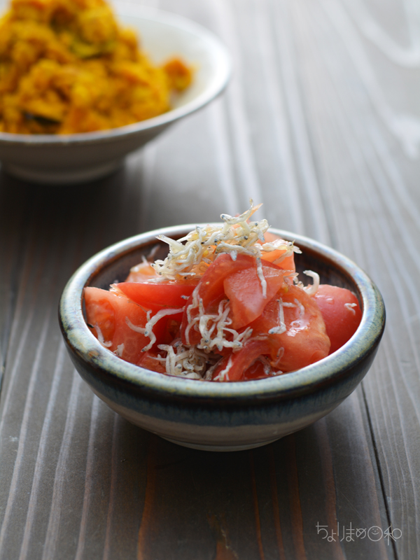 トマト、ちりめんじゃこ、すだち、塩、ごま油。
