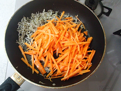 2.にんじんを入れてさらに炒め、にんじんに火が通ったらAを加えて汁気がなくなるまで炒める。唐辛子を散らす。