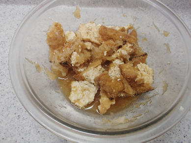 厚揚げは断面に凹凸があると味がからみやすいので手でちぎります。