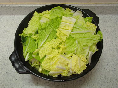 2.鍋に白菜の芯に近い部分から1/3量入れ、【1】を1/2量、白菜を1/3量、【1】の残り、白菜の残りをつめる。