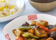 サバと野菜のトマト黒酢オイスター。とうもろこしと干しえびの混ぜチャーハン。の晩ご飯。